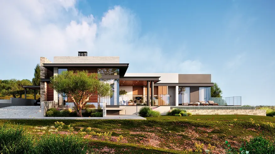 The orientation maximizes views towards the surrounding landscape, while the L-shaped layout provides both openness and privacy. The result is a calm, contemporary dwelling defined by clarity, light, and a strong relationship to its environment.